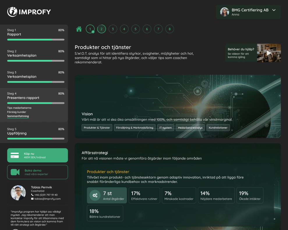 De flesta företag vet vad som behöver göras för att växa. Det som saknas är struktur, fokus och ett sätt att få det gjort – varje vecka. Improfy gör strategi till handling och handling till resultat.
