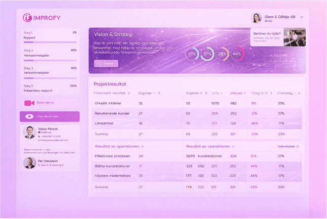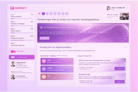 Improfys webbprogram ger konsultföretag ett strukturerat arbetssätt för att gå från analys till åtgärdsplan och uppföljning – snabbare och med högre kvalitet. Med stöd av metodik, AI och en erfaren coach kan ni leverera projekt som skapar verklig förändring hos kunden.